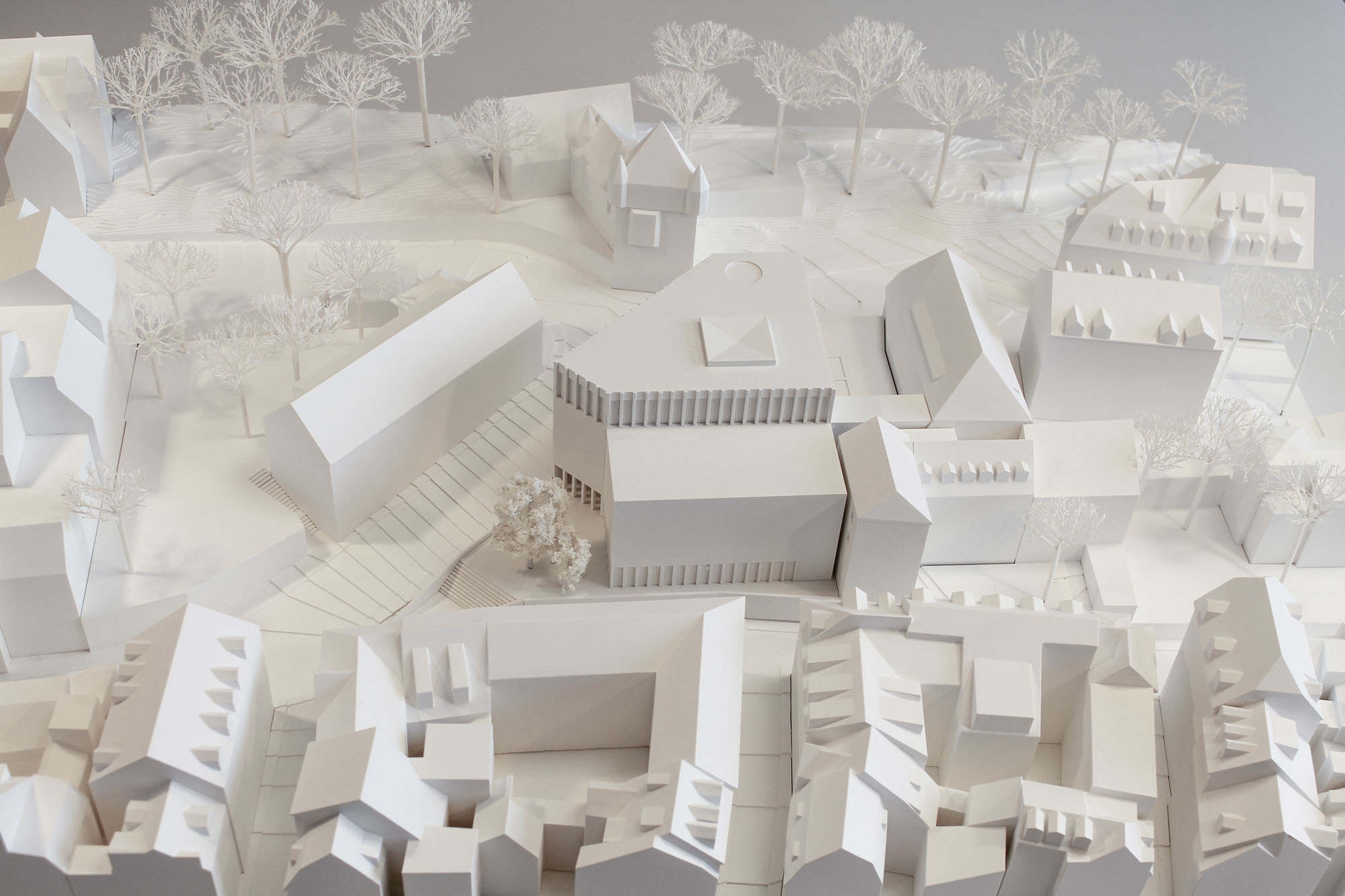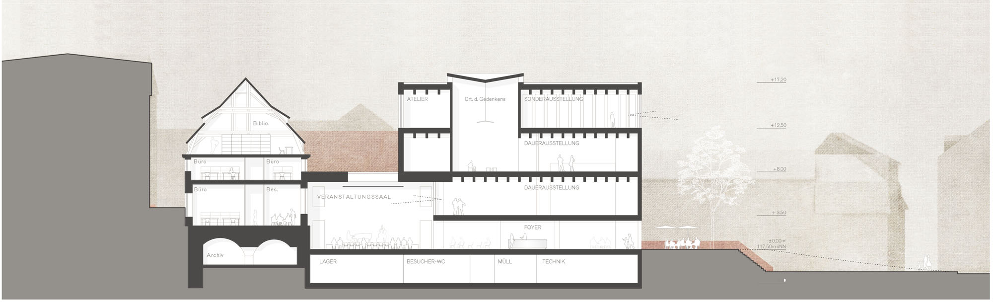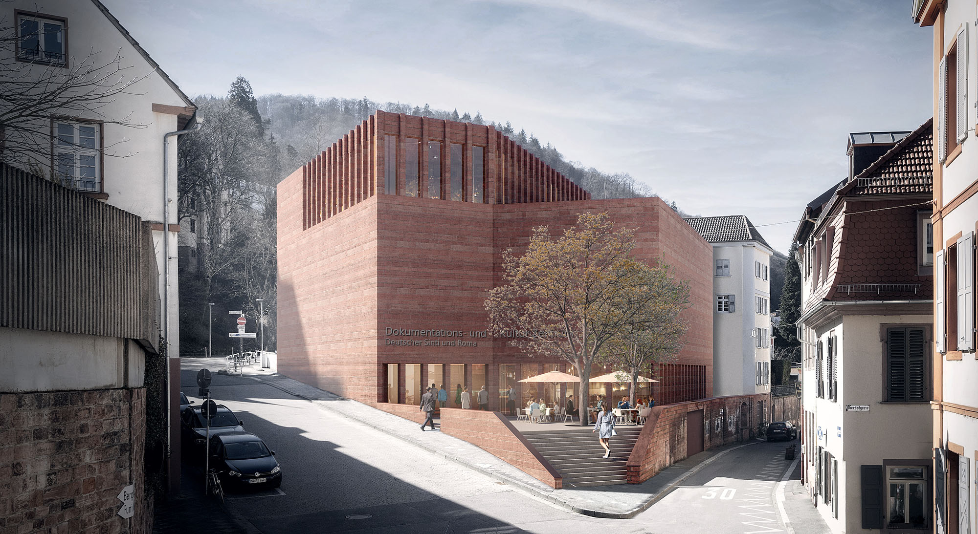 Im nicht offenen, zweistufigen Wettbewerb waren Architekturbüros aus ganz Europa aufgefordert, eine kluge städtebauliche Lösung für das Raumprogramm vorzuschlagen. Denn der Neubau soll das Zentrum nicht nur besser sichtbar der Gesellschaft öffnen, er wird auch die neue Dauerausstellung sowie Räume für Wechselausstellungen, Tagungen und Veranstaltungen beherbergen. Unter 25 Entwürfen setzte sich das Stuttgarter Büro bez+kock architekten durch, das auf dem keilförmigen Grundstück ein prägnantes Gebäude in ortstypischem rotem Buntsandstein vorschlug. Eine einladende Treppe öffnet das Haus zur Stadt und mündet in ein Podest, über das der barrierefreie Zugang möglich ist. Ein großzügiges Foyer mit Räumen für Veranstaltungen wird in den Obergeschossen durch Ausstellungsräume ergänzt, die im Dachgeschoss Blicke in die Stadt und die Umgebung öffnen. Mit diesem Haus wird das Dokumentations- und Kulturzentrum eine europaweite Strahlkraft für die kulturpolitische Arbeit der Sinti und Roma haben.