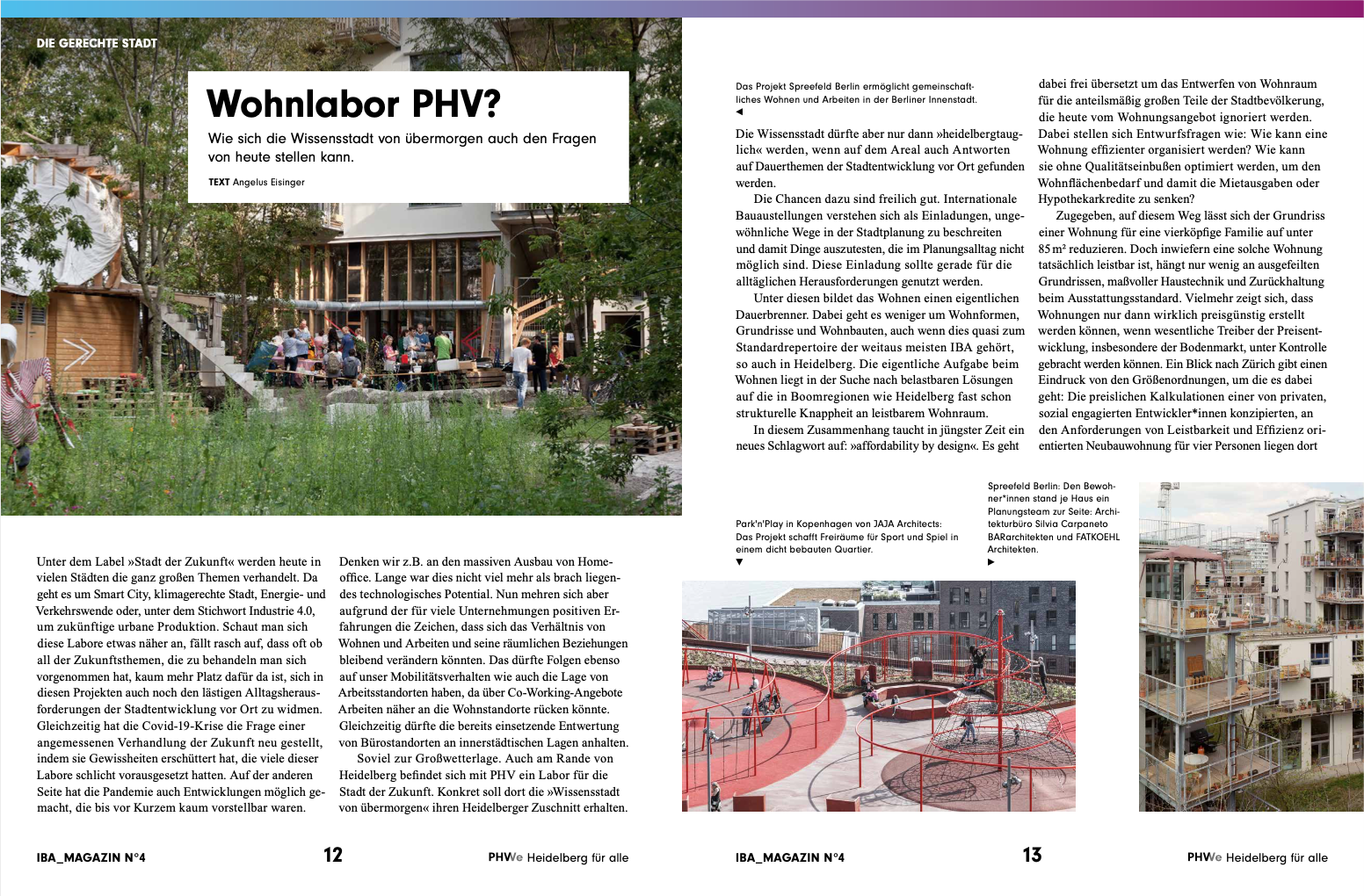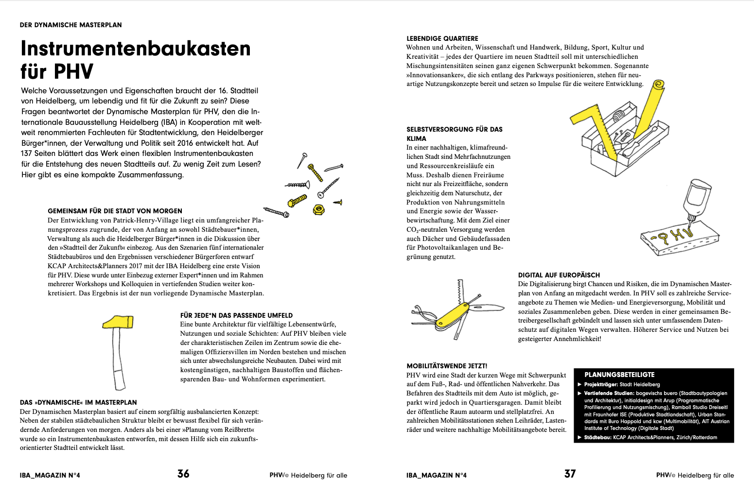Quartiere am Reißbrett zu planen und für Zielgruppen mit definierten Wünschen und Bedürfnissen zu entwerfen – lange Zeit hielten Städte und Kommunen an »gesicherten Strukturen« fest. Doch in einer immer komplexeren Gesellschaft bestimmt das Unbestimmte die Zukunft. Wie reagieren Städtebau und Architektur auf dieses Phänomen? Dieser Frage geht die vierte Ausgabe des IBA-Magazins am Beispiel Patrick-Henry-Village (PHV) auf den Grund. Welche Voraussetzungen und Eigenschaften braucht Heidelbergs zukünftiger 16. Stadtteil, um lebendig und fit für das Morgen zu sein? Der Dynamische Masterplan für PHV gibt den Rahmen vor – jetzt heißt es, ihn mit Ideen und Projekten schrittweise zum Leben zu erwecken.