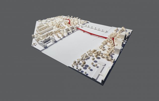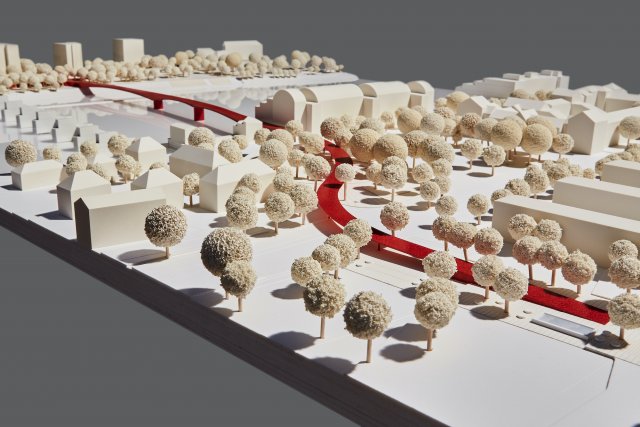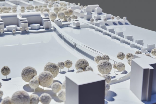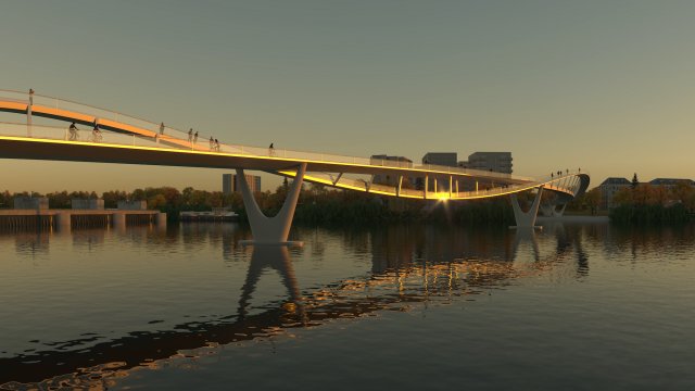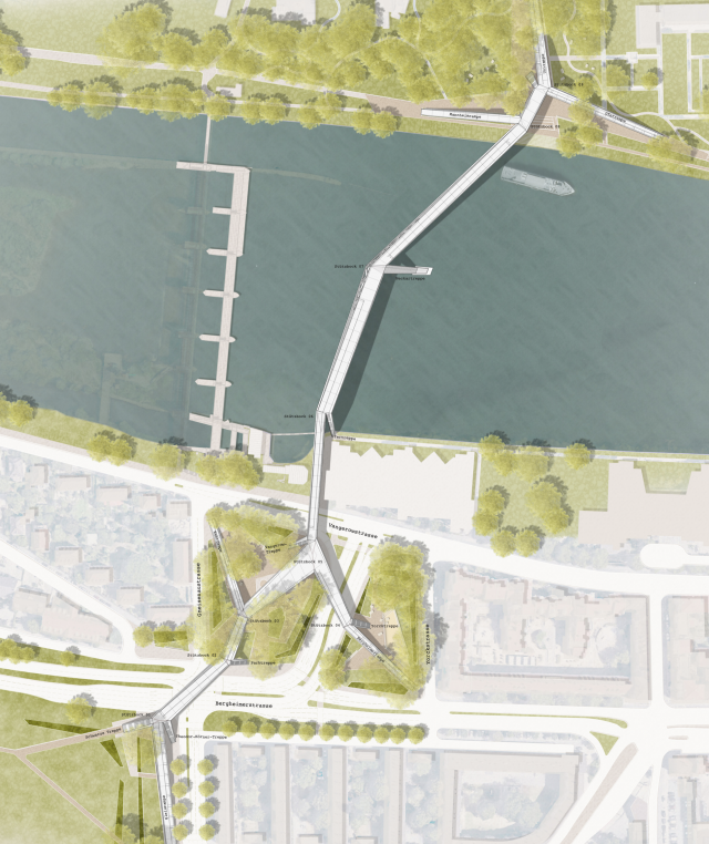 Das Ingenieurteam Bergmeister aus Vahrn (Italien), J2M jeckel mayr metz architekten aus München und lohrer.hochrein landschaftsarchitekten und stadtplaner aus München sehen die neue Brücke als Wegegeflecht, das entlang der Hauptverbindung Bahnstadt-Universität weitgehend alle quer verlaufenden Wegerichtungen aufgreift und so allen Radfahrer*innen und Fußgänger*innen einen möglichst direkten Zugang und kurzen Übergang ermöglicht. Die Brücke dient auch als Aufenthaltsfläche: In ihrer Mitte werden Sitzstufen sowie eine Terrasse auf Wasserniveau eingeplant. Die Jury lobt den mutigen Ansatz der radikalen Vernetzung und die Durchgängigkeit des von Polygonen geprägten Gestaltungsansatzes.