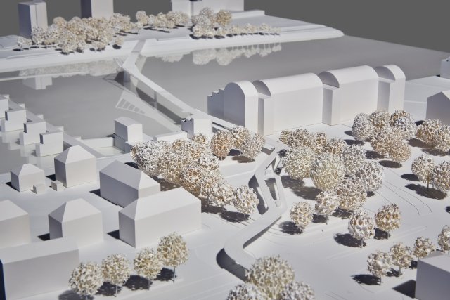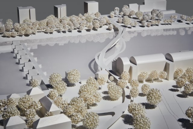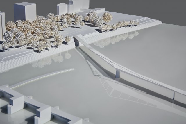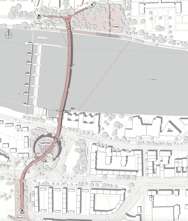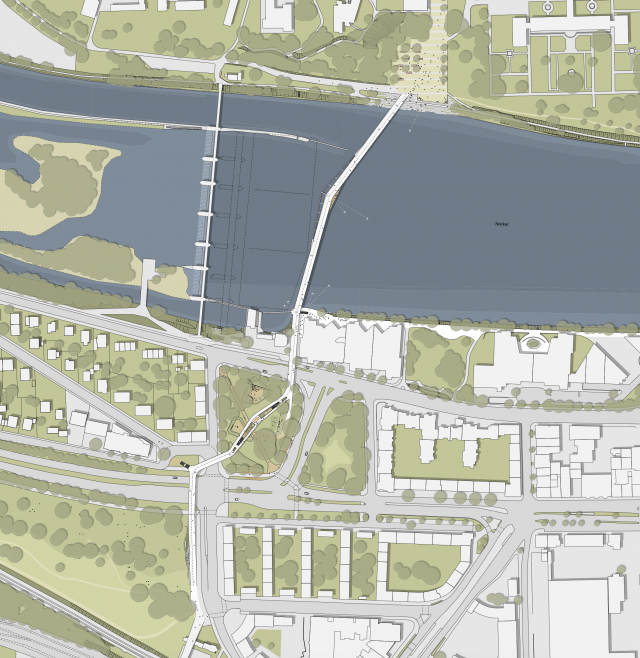schlaich bergermann partner (Stuttgart/Berlin), LAVA – Laboratory for Visionary Architecture (Berlin) und Latz + Partner Landschaftsarchitekten Stadtplaner (Kranzberg) schlagen eine zurückhaltend gestaltete Brücke vor, die vom Ochsenkopf kommend entlang des östlichen Randes des Gneisenauplatzes durch die Wipfel der weitgehend erhaltenen Bäume führt. Über dem Neckar weitet sich die Brücke zu einer Sitzlandschaft auf. Sogenannte Neckarbalkone am nördlichen und südlichen Ufer führen direkt über das Wasser. Überzeugt hat die Jury, dass der Beitrag in einer großen geschwungenen Geste die drei wesentlichen Orte der Wettbewerbsaufgabe verbindet. Die freiräumliche Ausgestaltung bedient sich der gleichen Formensprache und schafft unterschiedliche Orte im Neckarbereich mit verschiedenartiger Qualität, wie etwa Sitzterrassen und Balkone über dem Fluss. Der Gestaltungsvorschlag für den Gneisenauplatz lässt dort einen kleinen geschützten Park entstehen.