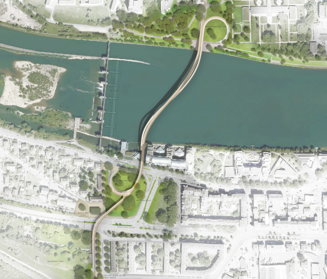 Die Planungsbüros DVVD / Harrer Ingenieure (Paris/Karlsruhe), DVA – Daniel Vaniche & Associés (Paris) und BIERBAUM.AICHELE.landschaftsarchitekten (Mainz) haben eine gleichmäßig charakteristisch geschwungene Brücke mit zwei verschiedenen Wegen über den Neckar entworfen: Neben einer mittig verlaufenden, parallelen Fuß- und Radwegverbindung hebt sich seitlich davon ein weiterer, schmalerer Fußweg ab, der auf und ab schwingt und besondere Ausblicke bietet. Neben den drei Rampenaufgängen verbessern am Gneisenauplatz und am südlichen Neckarufer zusätzliche Treppen die Anbindung der neuen Brücke.