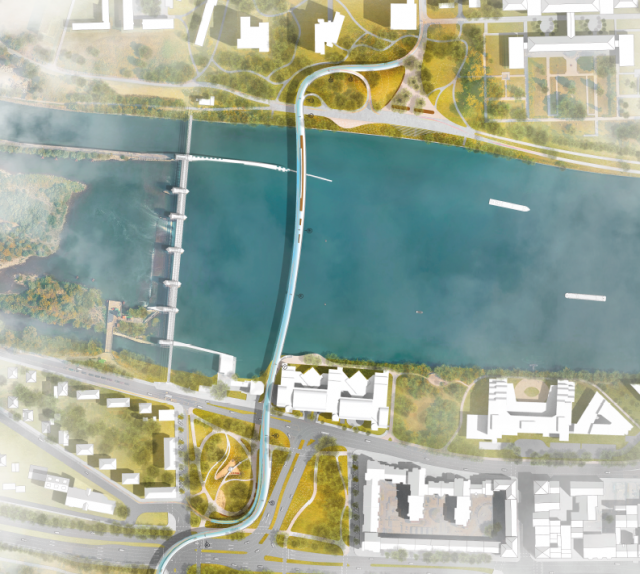 Die drei Büros SETEC TPI, Explorations Architecture und Marti Baron aus Paris schlagen zusammen mit metris architekten + stadtplaner aus Heidelberg eine schlanke Brücke aus rot eingefärbtem Beton vor. Dazu sind drei prägnante Aufenthaltsorte angedacht: ein Platz zwischen der neuen Brücke und der Gneisenaubrücke mit einer Wasserfläche, ein kreisrunder Garten auf dem westlichen Gneisenauplatz mit einer vielfältigen Bepflanzung sowie ein Park am nördlichen Neckarufer, der mit einer Terrasse als »Belvedere« mit der Universität verbunden werden soll.